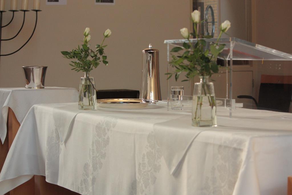 Dankzij de inspanningen van de activiteitencommissie hebben wij in november 2014 nieuw linnen voor de Avondmaalstafel kunnen aanschaffen. In dit prachtig geweven linnen is een diagonaal patroon van druivenranken opgenomen.
